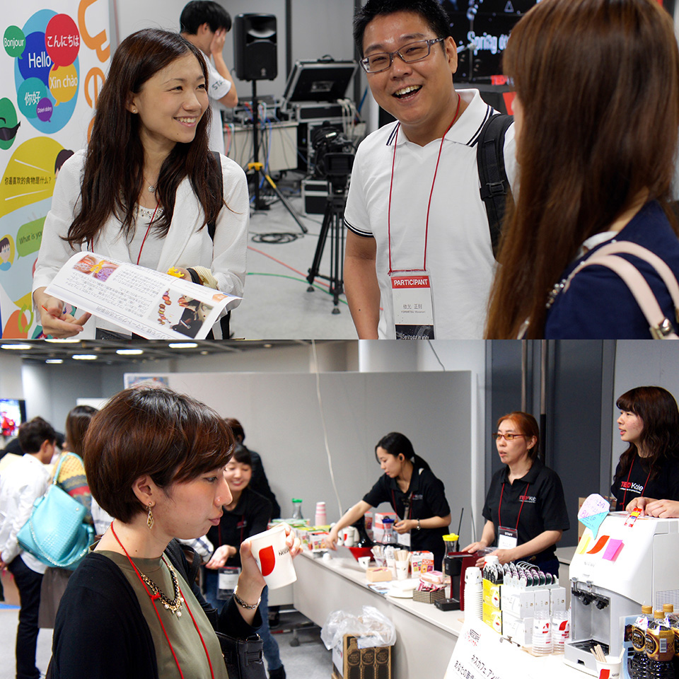 エキシビジョンホールでは、ランチからブレイクタイム、そしてアフターパーティーを通じて多くの企画を実施しており、終始盛り上がっていました。特に目を引いいたのは4Kを使って行われた動画配信です。そして、多くのパートナー様との共同企画でした。TEDxKobeを支えるステージ裏を案内するBackstage tourやYogiboを使い、LANGUAGE RESOURCESの先生方と英語で交流するリラックススペースの設置や、主に就職を控えた学生を対象に、誰でもわかる財務分析アクティビティを開催いたしました。Break中には、六甲バター様からチーズやおつまみが、Redbull様からエネルギードリンクが、ネスレ様からはバリスタやドルチェグストを使ってコーヒーなどが提供されました。また、パートナー様の共同企画により、自由に形を組み上げられるキューブ型ディスプレイ「Microtile」を使い、全く新しいインタラクティブアートを作り上げました。会場内には自動顔認識技術を使って写真を撮るアクティビテもあり多くの参加者の皆様に楽しんでいただきました。