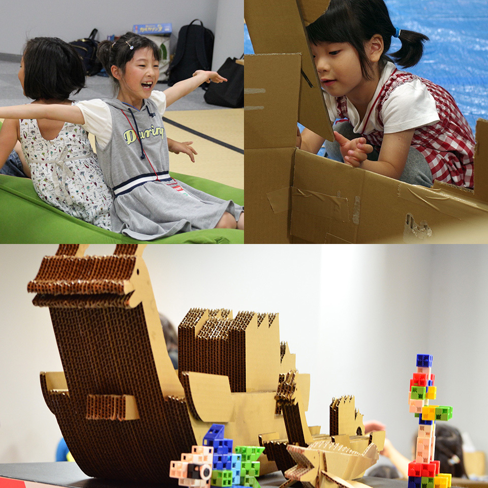 親子でセッションを観ることができるファミリースペースを設置しました。当日は20人以上のお子様が来られ、存分にアイデアを発揮してくれました。ダンボール工作ではお子様逹が協力してアイスクリーム屋さんや温泉を作成。内にはアイスクリームやイス、トイレ、ペットの犬があり、全てお子様の自由な発想で作り、テーマパークのような賑わいを見せていました。アーテックブロックもお子様のアイデアを表現する助けになり、個性ある作品が入口のロゴブロックに並びました。それを見た周囲の参加者は写真を撮ったり、自らお子様のアイデアの内に飛び込んで子どものような笑顔を浮かべていました。今日初めて会った大人と子どもが一緒に遊ぶ、日常にはない空間がそこにありました。
