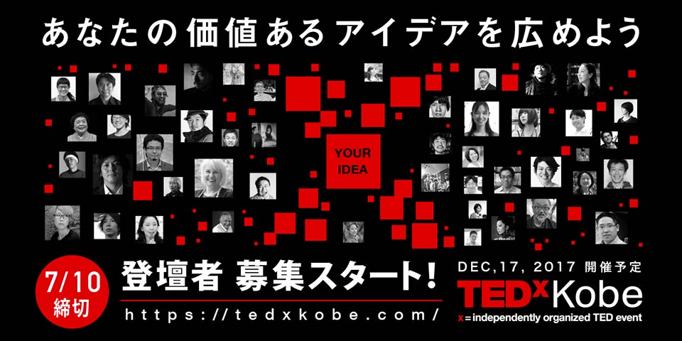 2017年12月17日に行われる「TEDxKobe」では、より多くの方の素晴らしいアイデアを世界に送り出すべく、登壇者を公募いたします。つきましては、以下の概要で「スピーカーオーディション for TEDxKobe 2017」を開催いたしますので、みなさまのご応募をお待ちしております。
