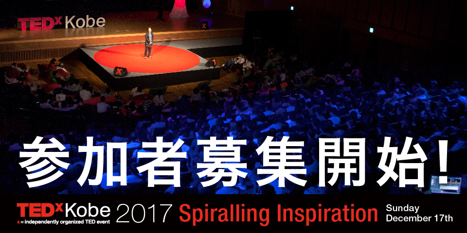 2017年12月17日(日)に「甲南大学・岡本キャンパス」で開催される、「TEDxKobe 2017」の参加者公募がついに始まりました。2017年度のテーマは「Spiralling Inspiration」です。異質なもの。相反するもの。時に不快なものさえ受け止め合い、根気よく対話しながら共に進む。互いに刺激しあい、高め合うことで描くスパイラルが、さらなるインスピレーションを生み出す。その力が、やがて巨大な渦となって変化を後押しします。まずは隣り合うこと。そして対話し、生み出し、ともに創り上げましょう。TEDxKobeでは、そんな決意を込めてこのテーマを掲げました。