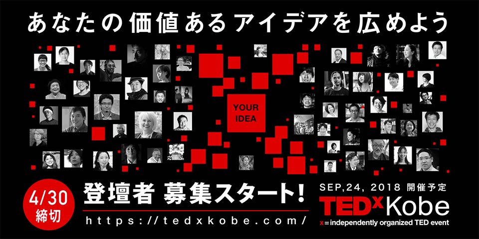 2018年9月24日(月)に行われる「TEDxKobe」では、より多くの方の素晴らしいアイデアを世界に送り出すべく、登壇者を公募いたします。つきましては、以下の概要で「スピーカーオーディション for TEDxKobe 2018」を開催いたしますので、みなさまのご応募をお待ちしております。