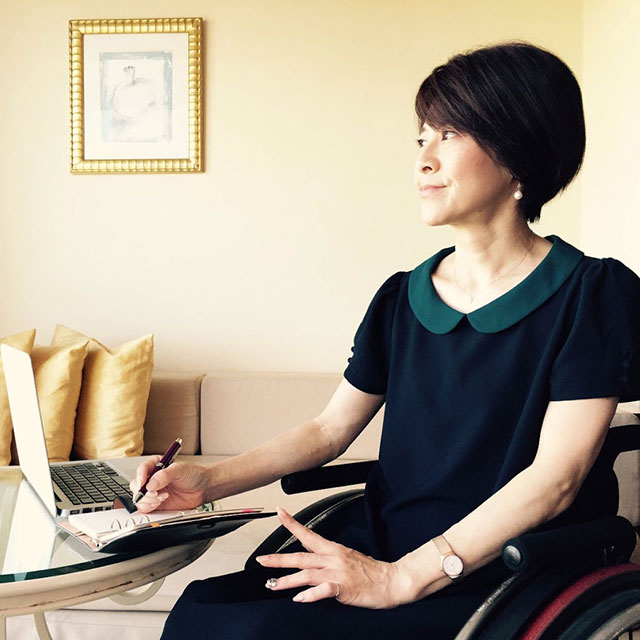 Hiromi Kishida’s eldest son was born with intellectual disability. After the sudden death of her husband, in 2008, she herself was struck down with a serious disease whose survival rate was mere 20%. She was saved from death but the disease left her with a paralyzed lower body; afterwards, she started living life in a wheelchair. Kishida is currently a lecturer at Mirairo Ltd. She gives lectures on hospitality and customer relations to physically challenged people. She is also a lecturer at the Japan Universal Manner Association.